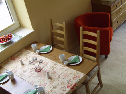 Ein großer ausklappbarer Eßtisch bietet Platz für die kleinere und größere gesellige Runde.