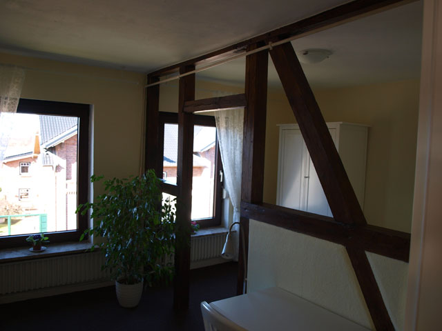Unterhalb vom Schlafboden befindet sich das Schlafzimmer 2. Es ist durch eine offene Fachwerk Konstruktion in 2 Bereiche geteilt.